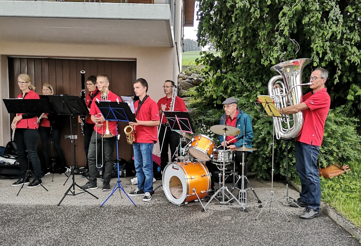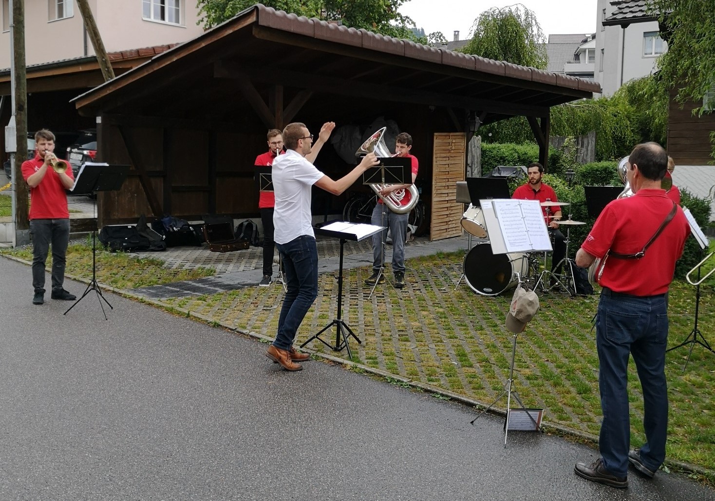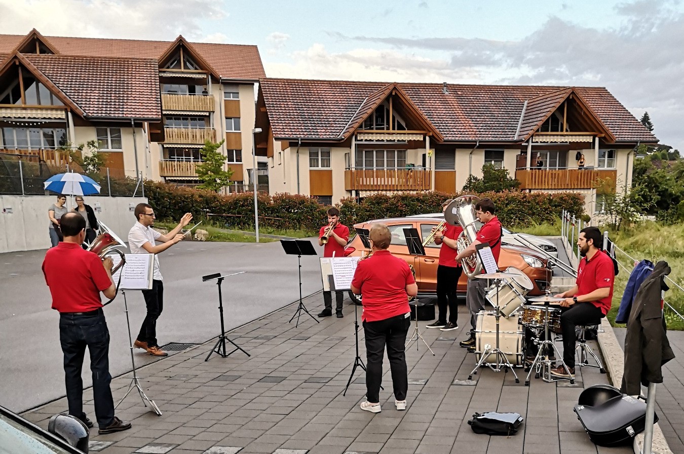 So spielte am Montag die Formation 7-Brass im unteren Teil von Rüediswil, das heisst im Moosguetpark, im Rosemättli und im Under Neuhus. Am Dienstag führte die Band 17-Winds die Ständli-Tour im oberen Teil von Rüediswil weiter. Leider war bereits nach 7 Stücken Schluss, Petrus ☂ war diesmal stärker als wir. Dafür gab es zum Abschluss ein Bier ? vom Fahnengötti.