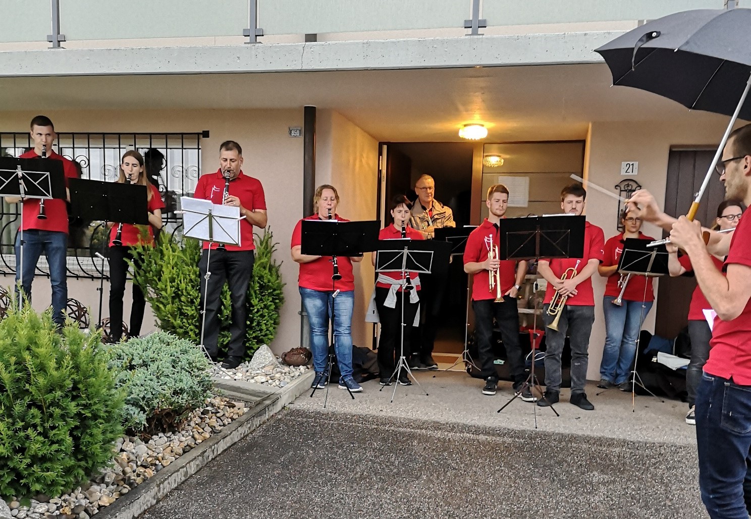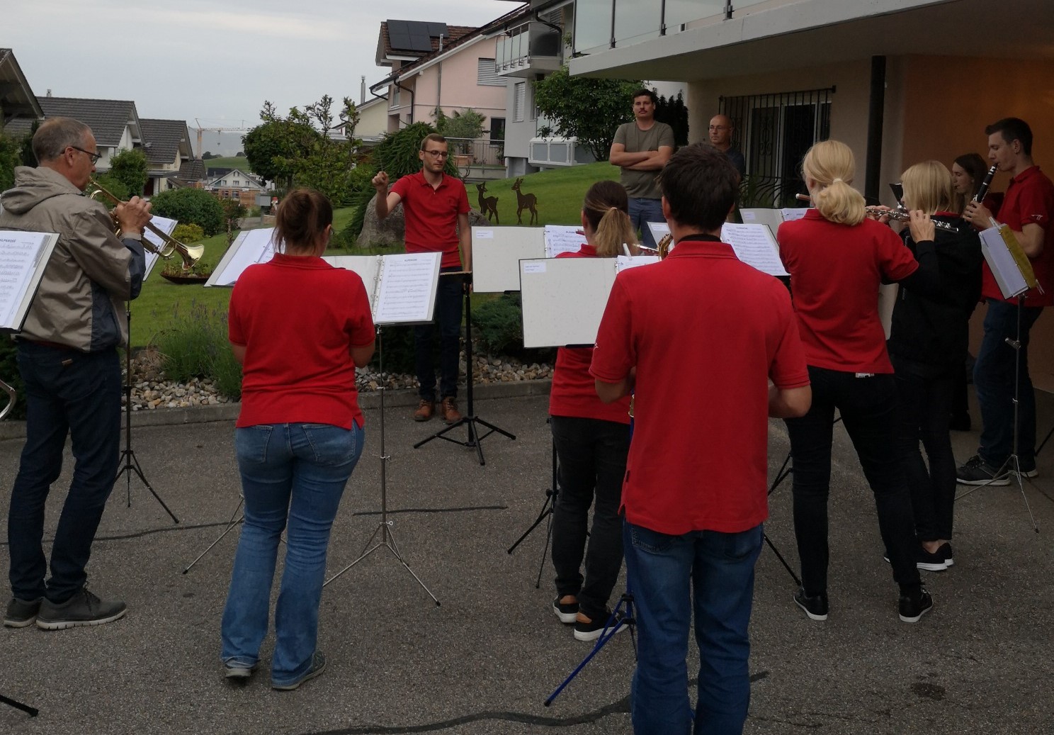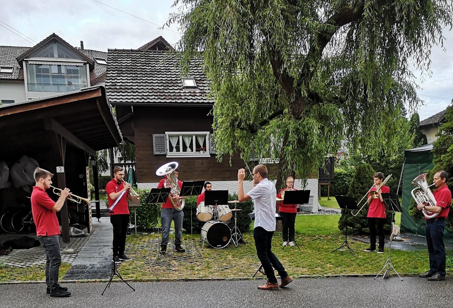 So spielte am Montag die Formation 7-Brass im unteren Teil von Rüediswil, das heisst im Moosguetpark, im Rosemättli und im Under Neuhus. Am Dienstag führte die Band 17-Winds die Ständli-Tour im oberen Teil von Rüediswil weiter. Leider war bereits nach 7 Stücken Schluss, Petrus ☂ war diesmal stärker als wir. Dafür gab es zum Abschluss ein Bier ? vom Fahnengötti.